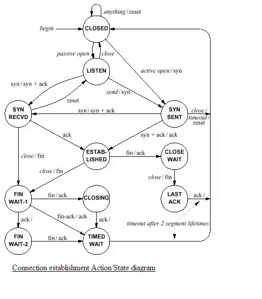 The states are: LISTEN, SYN-SENT, SYN-RECEIVED,ESTABLISHED, FIN-WAIT-1, FIN-WAIT-2, CLOSE-WAIT, CLOSING, LAST-ACK, TIME-WAIT, and the fictional state CLOSED. CLOSED is fictional because it represents the state when there is no TCB, and therefore, no connection. Briefly the meanings of the states are: