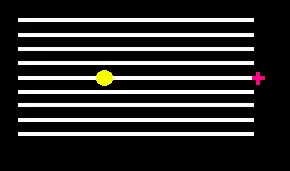 Shut the right eye and focus on the pink cross with the left eye, if the head is moved towards the pink cross there is a point at which the yellow disk disappears but the white lines are still present. In this "filling in" the visual field does not appear to be distorted.