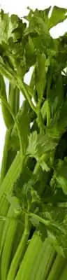 Celery is a green vegetable. Usually the long crunchy stalks are eaten, but people also eat the leaves and main root. Celery is very low in Calories, high in water, and high in salt.