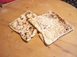 Gözleme is a savoury traditional Turkish flatbread dish, made of hand-rolled dough that is lightly brushed with butter and eggs, filled with various toppings, sealed, and cooked over a griddle. The name derives from the Turkish word "göz", meaning "compartment", in reference to the pocket of dough in which the various toppings are sealed and cooked. Traditionally, this is done over a saç griddle.
