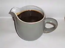 Colour may also be added as "browning", a caramel solution in water. Gravy can be flavoured with herbs and seasonings or a proprietary meat stock may be added. Poultry gravy is usually lighter in colour than gravies to accompany red meat. Gravy is usually served from a small jug called a gravy boat.