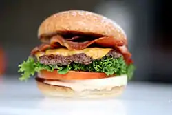 A hamburger is a variant on a sandwich involving a patty of ground meat, usually beef (known in the United Kingdom as a beefburger)), or a vegetarian patty. A slice of cheese on the patty makes it a cheeseburger, a common variation in the United States.