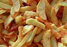 Potato Chips (crisps in the UK), are deep-fat fried potatoes. Most chips have salt on them. Chips are thinner and more cooked than French fries, making them crunchy. In the United Kingdom, "chip" usually refers to french fries.