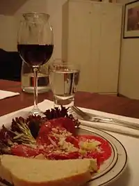 - Carpaccio of beef on chicory leaves and olive oil topped with Parmesan cheese and Provençal herbs decorated with grissini (breadsticks) and served with white bread