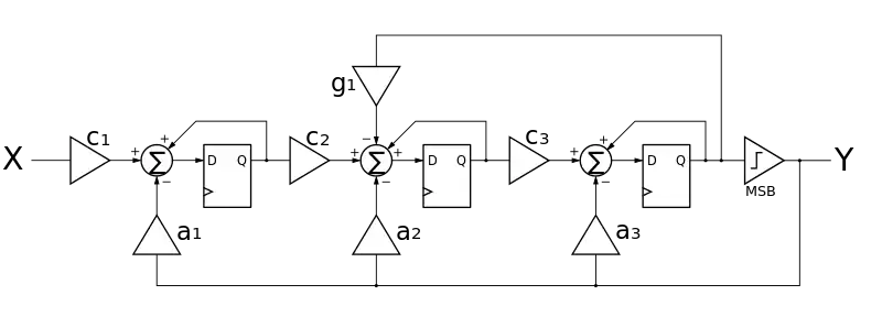 The following picture shows a Simplified Chain of Integrators with FeedBack (SCIFB) modulator [2]:
