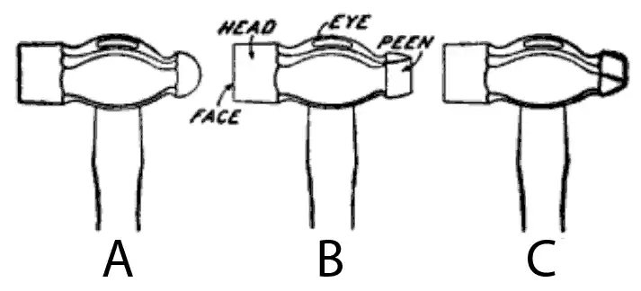 - cross-peen hammer (C) -- this style is most commonly associated with the blacksmith's trade. It has a fairly large diameter face, opposite the face is the peen which will look like a narrow face running perpendicular to the axis of the hammer handle. The face and peen are, typically, hardened. The straight-peen (B) and diagonal-peen variants are less common, but equally suitable for our purposes.