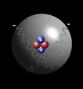 | Helium atom model Showing nucleus with two protons (blue) and two neutrons (red), orbited by two electrons (waves). | ||||||