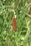 ![]() Typha latifolia The first record of T. angustifolia in North America is from northeast coastal regions in 1820, and it appears to have remained along the coast for the remainder of the 19th century. But by the end of the 20th century, it had migrated to the west coast, and as far south as Arkansas. Along its path, it seems to have preferred "early successional habitats with basic, calcareous, or somewhat salty soils."[4] It is thought that ditches along salted roadways may have helped facilitate the migration from coastal marshes.[5]