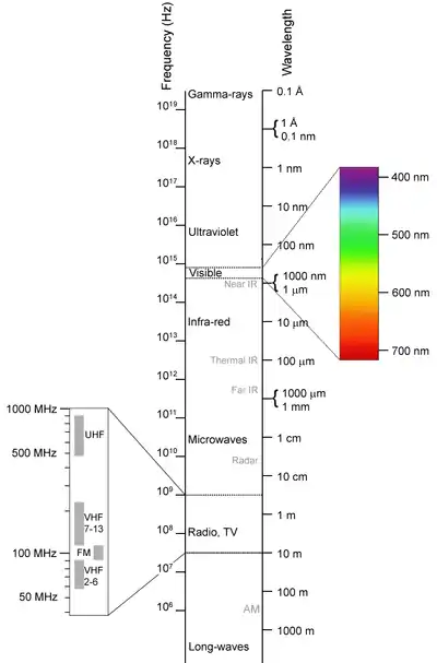 Light, or visible light, is a very narrow range of electromagnetic radiation of a wavelength that is visible to the human eye (about 400–700 nm), or up to 380–750 nm.[1] More broadly, physicists refer to light as electromagnetic radiation of all wavelengths, whether visible or not.