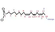 See Figure 3. The naming of this fatty acid could follow earlier taught principles and name this fatty acid 18:3(∆9,12,15) Alpha-linolenic acid. Or it could be named alternatively, with the Methyl group (CH3) end is named “ω” (omega) and number toward the carboxyl terminal, with the first unsaturated bond receiving the number three. This give us an omega-3 fatty acid. Both omega-3 and omega-6 fatty acids are essential fatty acids. (IUPAC, 2001)