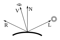 A perfectly shiny surface will reflect light from the light source only in the geometrically reflected direction R. For less than perfectly shiny surfaces, light is reflected to directions around R: the smaller the shininess, the wider the spreading. Mathematically, the normalized reflected direction R is defined by: