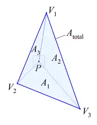 The triangle areas , , , and are also shown in the diagram. In three dimensions (or two dimensions with an additional third dimension) the area of a triangle between three points , , , can be computed as one half of the length of a cross product: