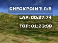 This contains timer counting up or down to display information about certain events (e.g. end of round), records such as lap times or the length of time a player can last in survival based game. HUDS can be used to display in-game time (time, day, year within the game) or even show real time.