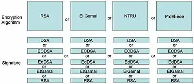 - ↑ NIST / Chen, Lily / Jordan, Stephen / Liu, Yi-Kai / Moody, Dustin / Peralta, Rene / Perlner, Ray / Smith-Tone, Daniel: NISTIR 8105, DRAFT, Report on Post-Quantum Cryptography, URL: http://csrc.nist.gov/publications/drafts/nistir-8105/nistir_8105_draft.pdf, National Institute of Standards and Technology. February 2016