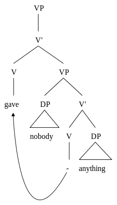 In light of the evidence above, a new structure for double-object constructions has been introduced, in which the verb originates between the two objects and moves to the front (the structure for VP + NP + NP constructions is actually slightly more complicated than has been shown here, but we're not in a position to reveal the whole story):