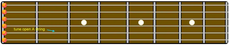 The fretboard diagram below shows the pairs of harmonics that are used. You start by tuning the harmonic on the 7th fret of the A string to the harmonic on the low E string. Then the harmonic on the 7th fret of the D string is tuned with the harmonic on the 5th fret of the A string. Tuning the G string to the D string is done in the same manner. Tune the harmonic on the B string to the harmonic on the 4th fret of the G string. Tune the harmonic on the e string to the harmonic on the B string.