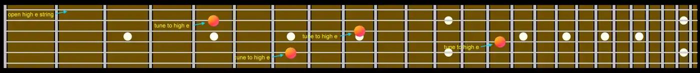 This method of tuning uses harmonics. By lightly touching a string directly above its fret-wire the fundamental of a note is silenced leaving only a series of overtones. Any note played on any instrument consists of a fundamental and a harmonic series of overtones. The twelfth, seventh and fifth nodes are the easiest frets with which to sound harmonics. After striking the string the finger should be removed quickly to produce the harmonic.