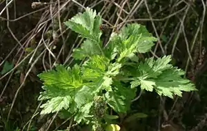 A. vulgaris is often confused with the Chinese mugwort (A. verlotiorum), which is very common too. The latter has oblonge reddish to brown capitula, its stems are green and the leaves broader, lighter coloured and more dense on the stem. The plant's scent is both stronger and more pleasant than that of the common mugwort. It flowers very late in the summer, but reproduces mainly by stolons, thus forming thick groups. The two species share the same habitats.