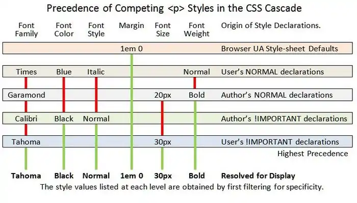 The possible style sources or origins are fivefold, and styles relevant to this paragraph tag might be found in any of them. In fact, competing styles might be found throughout. The styles' origins are listed here, in order of descending precedence: