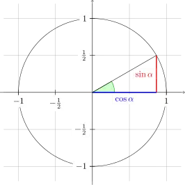 \draw[very thick,red] (30:1cm) -- node[left,fill=white] {$\sin \alpha$} (30:1cm |- x axis);