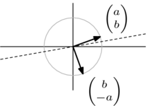 We can use this insight to delimit the geometric actions possible in distance-preserving maps. Because , any is mapped by to lie somewhere on the circle about the origin that has radius equal to the length of . In particular, and are mapped to the unit circle. What's more, once we fix the unit vector as mapped to the vector with components and then there are only two places where can be mapped if that image is to be perpendicular to the first vector: one where maintains its position a quarter circle clockwise from