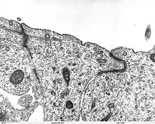 The thumbnail on the right shows the typical features of a cell as seen under with a light microscope using a standard stain. The chief features are a cell membrane, a granular cytoplasm, and a nucleus with in most cases a darker staining nucleous.