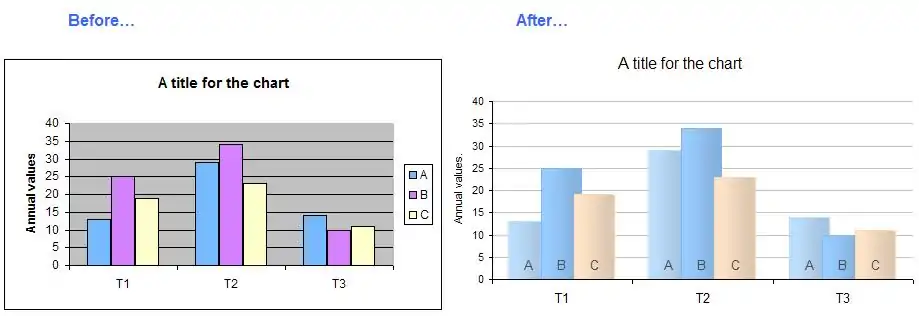 While this approach is understandable, the problem is that it results in charts lacking visual appeal. The best way to correct this is to see the effect of making some changes. Please note that there are many ways to do this, and these changes are not necessarily the best.