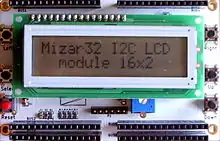 The Mizar32 LCD Display is an add-on hardware module that plugs into all six of the Mizar32 main board's bus connectors. It has a 16-column by 2-line Liquid Crystal Display, where each position can display one of a range of characters, and it has six push buttons: left, right, up, down, select and reset.