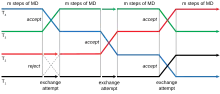 Replica Exchange molecular dynamics involves performing simultaneous simulations on many () copies of a system with a different value for a certain control variable. Parallel tempering is a replica exchange method in which temperature is used as the control parameter. A set of temperatures are assigned to the copies of a system satisfying . The probability distribution for an independent system depends on the configuration of all the atoms within a system and represents the complete set of configurations for copies of the system. Replica exchange simulations are performed on canonical ensemble (NVT) systems. An exchange of coordinates between a neighbouring pair of replica is attempted, and the attempted move is accepted or rejected based on Metropolis Monte Carlo criterion[1].
