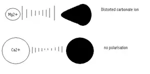 The change of shape is where the electrons are pulled onto one of the Oxygen atoms causing distortion in the carbonate ion. This change in shape reduces strength and causes the carbonate to break up when heated.
