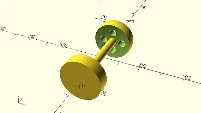 You should notice that something unexpected happened. A wheel has been created at the origin. This is the object of the simple_wheel script. When you use include, OpenSCAD treats the whole external script that you are including as if it was a part of your current script. In the simple_wheel.scad script, aside from the simple_wheel module definition, there is also a call to the simple_wheel module which creates a wheel object. As a result of using the include command this object is also created in the car’s model. This is something that you are going to change by using the use instead of the include command, but don’t bother about it for a moment.