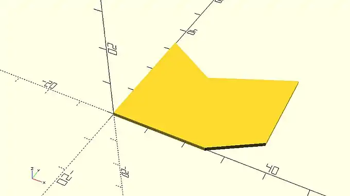 profile_1_polygon.scad p0 = [0, 0]; p1 = [0, 30]; p2 = [15, 30]; p3 = [35, 20]; p4 = [35, 0]; points = [p0, p1, p2, p3, p4]; polygon(points); |