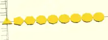 use <MCAD/regular_shapes.scad> radius = 5; translate([00,0,0]) triangle(radius); translate([10,0,0]) pentagon(radius); translate([20,0,0]) hexagon(radius); translate([30,0,0]) heptagon(radius); translate([40,0,0]) octagon(radius); translate([50,0,0]) nonagon(radius); translate([60,0,0]) decagon(radius); translate([70,0,0]) hendecagon(radius); translate([80,0,0]) dodecagon(radius);
