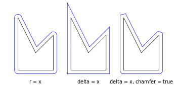 - Boolean. (default false) When using the delta parameter, this flag defines if edges should be chamfered (cut off with a straight line) or not (extended to their intersection).