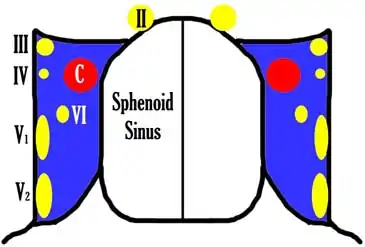 C = Carotid Artery: often with bony dehiscence into sphenoid. Together with CN II forms opticocarotid recess.