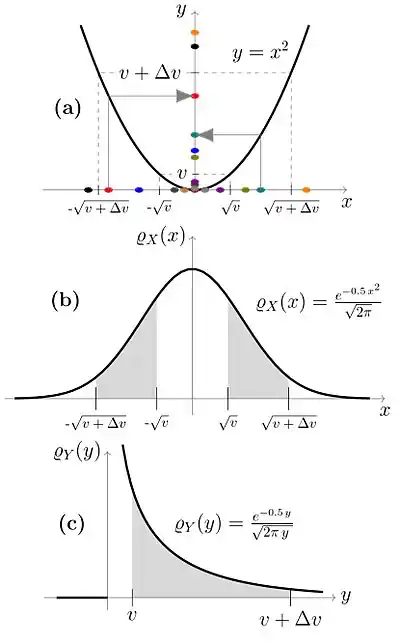 This rule often misleads physics books to present the following viewpoint, which might be easier to remember, but is not mathematically sound: If you multiply the probability density with the “infinitesimal length” , then you will get the probability for X to lie in the interval [x, x+dx]. Changing to new coordinates y, you will get by substitution: