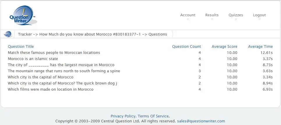 Question Writer Tracker is a free service from Question Writer. It allows you to track and analyze the results for all your quizzes published on line and also provides webspace where you can upload your quizzes for easy access.