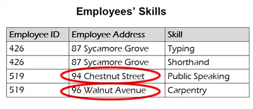 The example above shows an update anomaly. A database user has attempted to update an employee's address. However, since the address occurs more than once in the table and only one copy has been updated, there is now inconsistent data in the table: the employee cannot have two addresses at once.