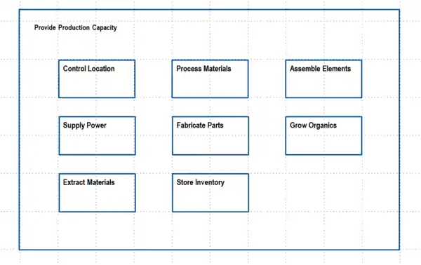 - Growth Capacity - Provide growth capacity after startup of 11%/year. Assigned only to F.2.1.1.1 Production as "Produce new equipment capable of 11% increased output per year." Outside components will be needed for the new equipment, and growth is measured by economic value of the output. Additions which take multiple years are distributed over the years for credit towards the goal.