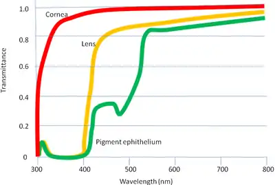Before being transduced, incoming EM passes through the cornea, lens and the macula. These structures also act as filters to reduce unwanted EM, thereby protecting the eye from harmful radiation. The filtering response of each of these elements can be seen in the figure "Filtering of the light performed by cornea, lens and pigment epithelium". As one may observe, the cornea attenuates the lower wavelengths, leaving the higher wavelengths nearly untouched. The lens blocks around 25% of the EM below 400nm and more than 50% below 430nm. Finally, the pigment ephithelium, the last stage of filtering before the photo-reception, affects around 30% of the EM between 430nm and 500nm.