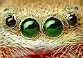Not only the type of eyes vary, but also the number of eyes. As you are well aware of, humans usually have two eyes, spiders on the other hand have a varying number of eyes, with most species having 8. Normally the spiders also have varying sizes of the different pairs of eyes and the differing sizes have different functions. For example, in jumping spiders 2 larger front facing eyes, give the spider excellent visual acuity, which is used mainly to target prey. 6 smaller eyes have much poorer resolution, but helps the spider to avoid potential dangers. Two photographs of the eyes of a jumping spider and the eyes of a wolf spider are shown to demonstrate the variability in the eye topologies of arachnids.