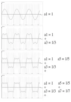 If we know the amplitude weightings and frequency components of the first sinusoidal components or partials of a complex waveform, we can reconstruct that waveform using an additive system with oscillators. The popular waveforms square, sawtooth and triangle are harmonic waveforms because the constituent sinusoidal components all have frequencies that are integer multiples of the fundamental. The property that distinguishes them in this form is that they all have unique amplitude weightings for each sinusoid. Fig. 6.2 demonstrates the appearance of the time-domain waveform as a set of sines at unique amplitude weightings are added together; in this case the form begins to approximate a square wave, with the accuracy increasing with each added partial. Note that to construct a square wave we only include odd numbered harmonics- the amplitude weightings for , , etc. are 0. Below is a table that demonstrates the partial amplitude weightings of the common waveshapes: