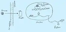 Both of them are hormones which are lipid soluble. These hormones can pass across the cell membrane and enter into cytosol or even the nucleus. Cholesterol is the single precursor molecule for Steroid hormones. The estrogens (female sex hormones) and androgens (male sex hormones) are two classes of steroid hormones. Estrogen can diffuse across the membrane of a target cell and interact with a specific receptor with the cytoplasm. After forming of steroid-receptor complex, it can pass through nucleus membrane and enter into the nucleus. In the nucleus, it changes the transcription of mRNA for certain protein.