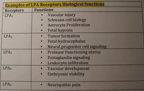 Lysophosphatidic acid (LPA) is a small, ubiquitous phospholipid that acts as an extracellular signaling molecule by binding to and activating G protein-coupled receptors. There are about five known G protein-coupled receptors (GPCRs): LPA1, LPA2, LPA3, LPA4 and LPA5. LPA has diverse biological roles such as developmental, physiological, and pathophysiological effects.