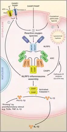 NOD1 activation may result in apoptosis through a number of protein-protein interactions. Notably, NOD1 has been shown to bind to pro-caspase-9, leading to caspase-mediated cell death. NOD1, via CARD may interact with the CSN6 component of the COP9 signalosome, which may synergize in the apoptotic pathway. However, NOD1 has also been shown to interact with both receptor-interacting serine-threonine protein kinase 2 (RIP2) and pro-caspase-1 as well for the enhancement of pro-IL-1β processing. NOD2 has been shown to be associated with mitochondrial antiviral signaling protein (MAVS) for the induction of type I interferons. Both NLRC proteins NOD1 and NOD2 interact with RIP2 through CARD-CARD interactions to induce nuclear factor-κB (NF-κB) and mitogen-activated protein kinase (MAPK) signaling. RIP2 interacts with regulatory NF-κB subunit NEMO/IKKγ, triggering IκB phosphorylation and NF-κB activation. NOD2, on the other hand, also interacts with TGF-β-activated kinase 1 and GRIM-19 which allows for the activation of IFN-β and NF-κB, subsequently upregulating production of chemokines and antimicrobial peptides. The inflammasome is a signal platform that is significant in the NLR family and its main purpose is for the processing and maturation of proinflammatory cytokines, IL-1β and IL-18. It is a multiprotein oligomer comprised of NLRP proteins, ASC adaptor molecule, caspase-1 and in some cases, caspase-5. Recruitment of the inflammasome complex permits binding from ASC molecule to caspase-1 p45 precursor, pro-caspase-1, which is autocatalytically cleaved into p10 and p20 subunits. Caspase-1 is then assembled into an active form consisting of p10/p20 heterodimers. Ultimately, caspase-1 is involved in inflammatory signaling through proteolytic cleavage of pro-IL-1B and pro-IL-18 into biologically active IL-1βp17 and IL-18p18, respectively. Several known inflammasomes exist composed of varying NLR and PYHIN proteins such as NLRP1, NLRP3, NLRC4 and AIM2. NLRP1 inflammasome consists of ASC adaptor protein, caspase-1 and caspase-5. NLRP2/3 inflammasome is composed of ASC adaptor protein, NLRP2, NLRP3, CARDINAL and caspase-1. NLRP3 inflammasome is the most characterized and studied inflammasome model to date. In particular, 3 models for NLRP3 activation are currently debated. One model suggests that extracellular ATP acts as an agonist for P2X7 receptor which triggers K+ efflux and pannexin-1 mediated membrane pore formation. This is thought to allow the entry of extracellular factors for direct NLRP3 activation as well as NLRP3 detection in K+ efflux and loss of membrane integrity. The second model implies that lysosomal destabilization initiated by the presence of DAMPs may cause rupture and release of lysosome content into the cytosol. Detection of lysosome components such as lysosomal protease cathepsin B may prompt activation as a direct NLRP3 ligand. The third model for NLRP3 activation suggests production of reactive oxygen species or ROS may be caused by NLRP3 agonists and detection of ROS via thioredoxin-interacting protein (TXNIP), a ROS-sensitive NLRP3 ligand may induce activation.