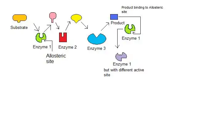 In the above image, the substrate first attaches itself to the Enzyme 1's active site, and the active site turns the substrate into a shape that is the same as the Enzyme 2's active site. This continues until the substrate turns into a product. The feedback inhibition starts when the product binds to the Enzyme 1's allosteric site, changing the shape of Enzyme 1's active site. Because the active site for Enzyme 1 has changed, the substrate that used to bind to Enzyme 1 can no longer bind to the enzymes anymore. Other kinds of substrate may be able to bind to the changed Enzyme, but may not be able to bind to Enzyme 2's active site.