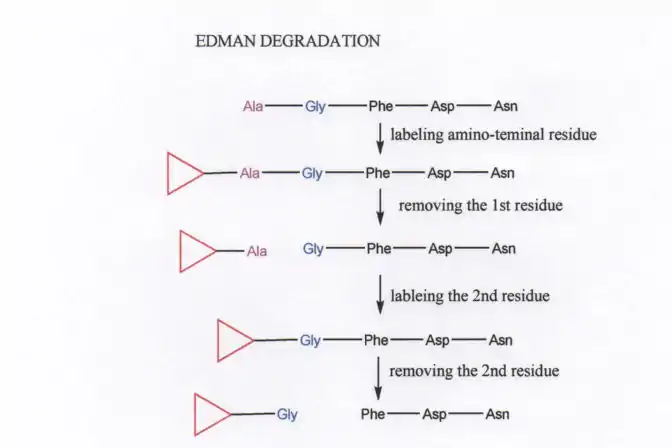 - This method is done by cleaving the amino acid one by one from the amino terminal. The chemical used for this process is Phenyl isothiocyanate. Amino acids that react with this chemical will form phenylthiohydantoin (PTH)-amino acid (e.g. PTH-glycine). Under mildly acidic conditions,( PHT)-one termial residue is released. This compound is then identified using chromatographic procedures. Edman degradation is quite simple to perform (the sequencer is automated), but this method is not effective for long peptides (more than 50 residues) because it takes an hour to perform one cycle of degradation.