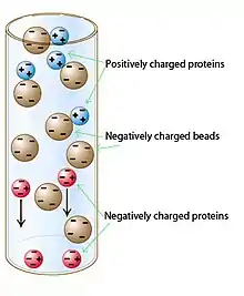 Ion Exchange Chromatography (IEC) is a purification method aimed at separating proteins based on charge, which is dependent on the composition of the mobile phase (a separation of mixtures that is dissolved). Adjusting the pH, or the ionic concentration, of the "mobile phase" allows for separation. For example, if a protein has a net positive charge of pH 7, it will bind to a column of negative charge beads. On the other hand a negatively charged protein would not. For example, if a proton has a net positive charge at pH of 7 then it will bind to a column of beads that contain the carboxyl groups, where as a negatively charged proteins will not. Once bound, the protein is eluted by increasing the ion concentration. The movement of a protein depends on the density of the net charge; the proteins that have a low density of net positive charge will emerge first. Proteins bind to ion exchangers due to the electrostatic forces between the surface of the protein charges and cluster of the charged group on the exchangers. A column is packed with a resin (usually cellulose or agarose) with a charged group bonded to it. This allows positively charged proteins, for example, to bind to the negatively charged beads on the column and the negatively charged proteins to flow through the column. Therefore ion exchange chromatography consists of cation exchange chromatography and anion exchange chromatography. In addition, a protein must displace the counterions and become attached; in other words, the net charge on the protein will be the same sign as that of the counterions displaced-therefore "ion exchange. The protein molecules in solution are neutralized by counterions also; the overall reaction must be electrically neutral. Whatever one wants to purify is known as the sample and the parts that are separated are known as the analytes. The sample is added to the top of the column and a buffered solution is used to elute it.