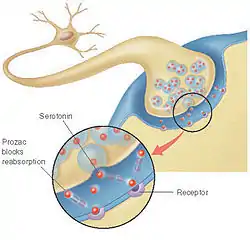 Neurotransmitters are signaling molecules that are used to transmit messages between neurons in the brain. The pathways of neurotransmitters in the synapse can be prolonged or shortened by specific chemicals called neuromodulators. Some neuromodulators can aid with the release of neurotransmitters into the synapse; others inhibit the reabsorption of neurotransmitters by neurons so that the neurotransmitters remain in the synapse. Under certain mental conditions such as bipolar disorder, obsessive-compulsive disorder, anxiety, and depression, the regulation of secretion and removal of neurotransmitters into the synapse is not functioning properly. In particular, in depression and similar disorders, neurotransmitter seretonin is one of the mostly affected. To treat depression, the most common form of drugs is called selective serotonin reuptake inhibitors (SSRI). Prozac is one of the most widely used member of this class.