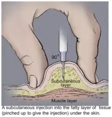 A subcutaneous injection (SC, SQ, SubQ) is a method of drug administration in which the drug is injected into hypodermis, the fatty tissue layer directly beneath the dermis and epidermis. Because there is limited blood flow to the hypodermis, subcutaneous injection is usually used when slow absorption of medication is preferred.[1] Drugs that are administered using this method must be soluble and potent in small concentrations. Common medications used with this procedure include heparin, insulin, growth hormones, and vaccines against MMR and varicella.